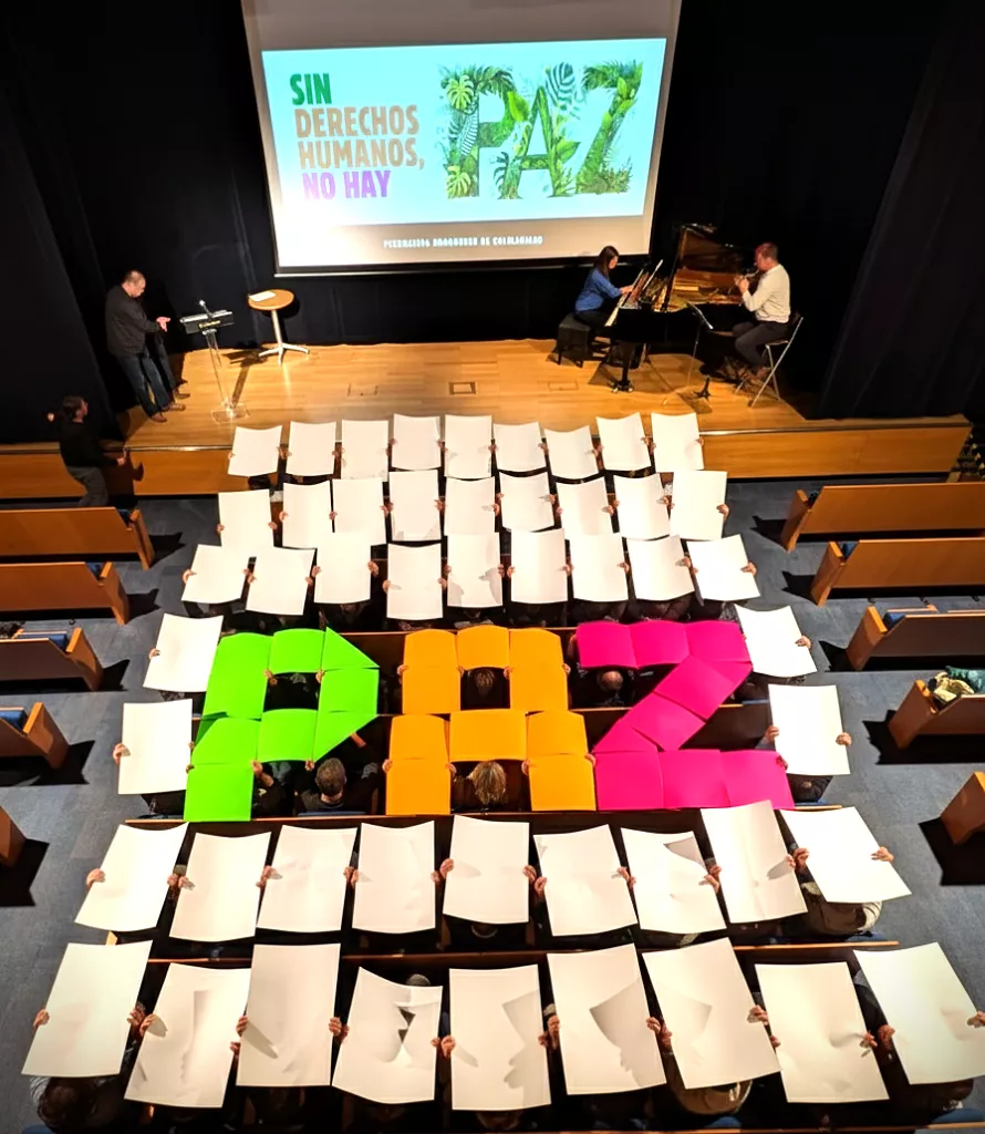 Las personas asistentes levantaron cartulinas de diferentes colores para formar un gran mosaico humano, visible desde lo alto de la sala. Una imagen poderosa, fruto de un gesto sencillo que expresó el compromiso compartido con la convivencia, los derechos humanos y la solidaridad internacional.