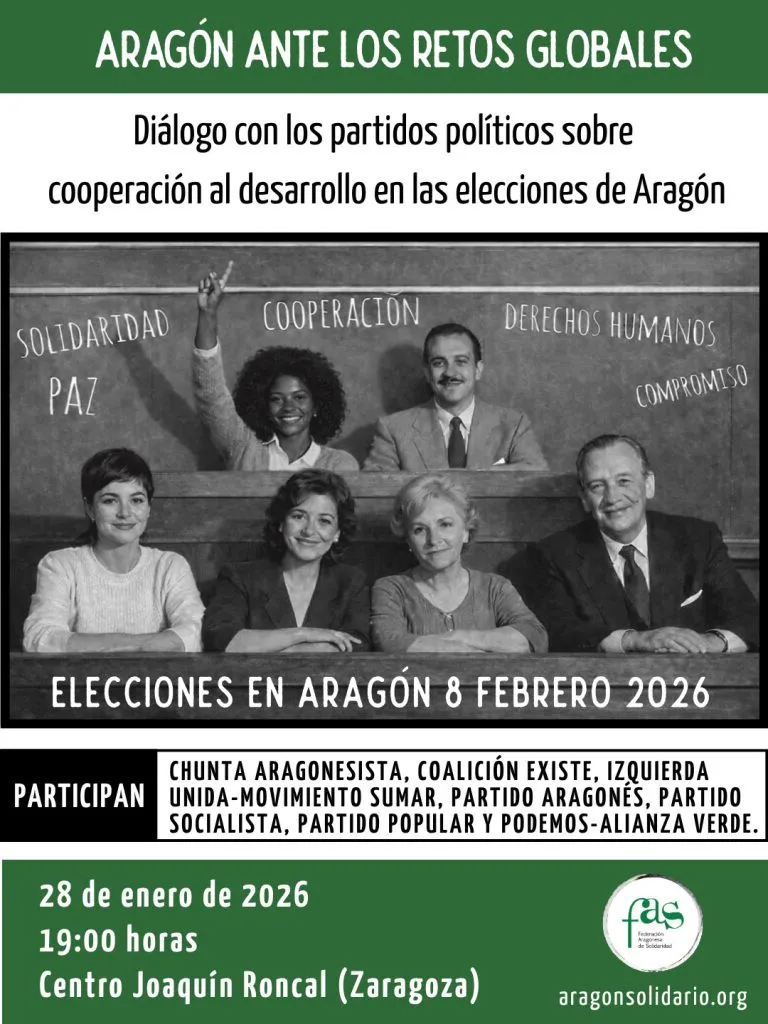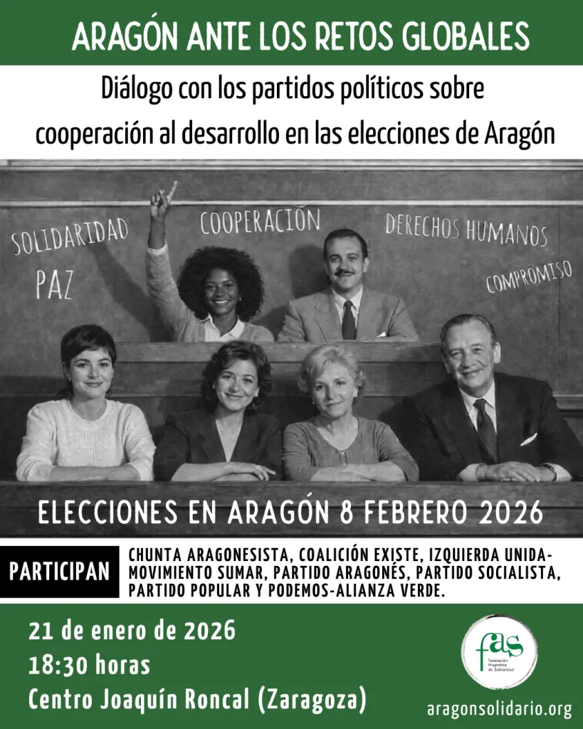 En el marco de las elecciones autonómicas de Aragón, que se celebrarán el próximo 8 de febrero de 2026, la Federación Aragonesa de Solidaridad (FAS) organiza un encuentro público con los partidos políticos candidatos para abrir un espacio de diálogo plural sobre el papel de la cooperación al desarrollo y la acción internacional en la próxima legislatura.