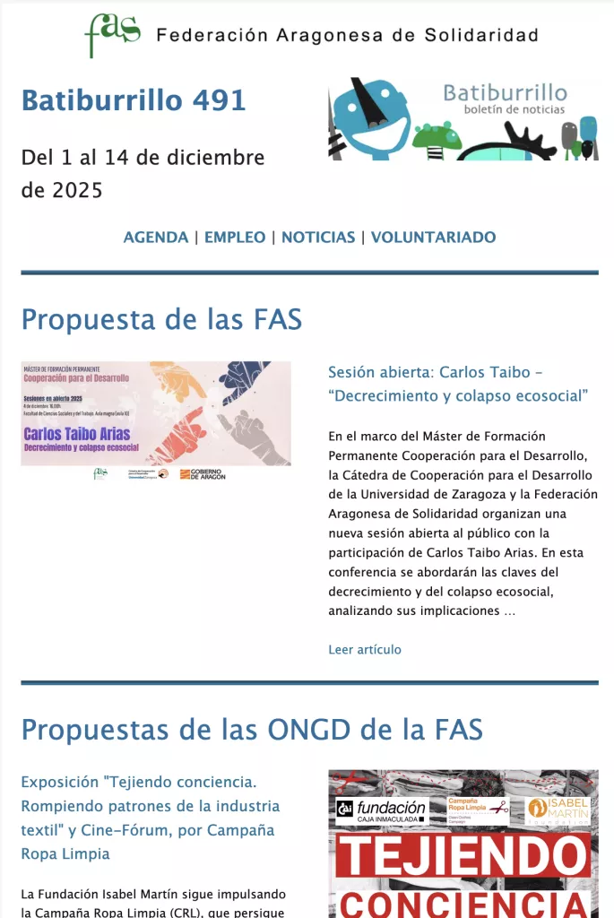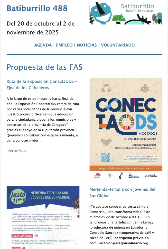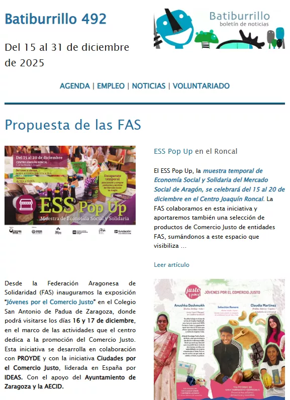 Conoce la agenda de actividades de la Federación Aragonesa de Solidaridad, sus ONGD y otras entidades a través de nuestro Boletín Informativo, BATIBURRILLO. Pincha en cada imagen para ir a la información.