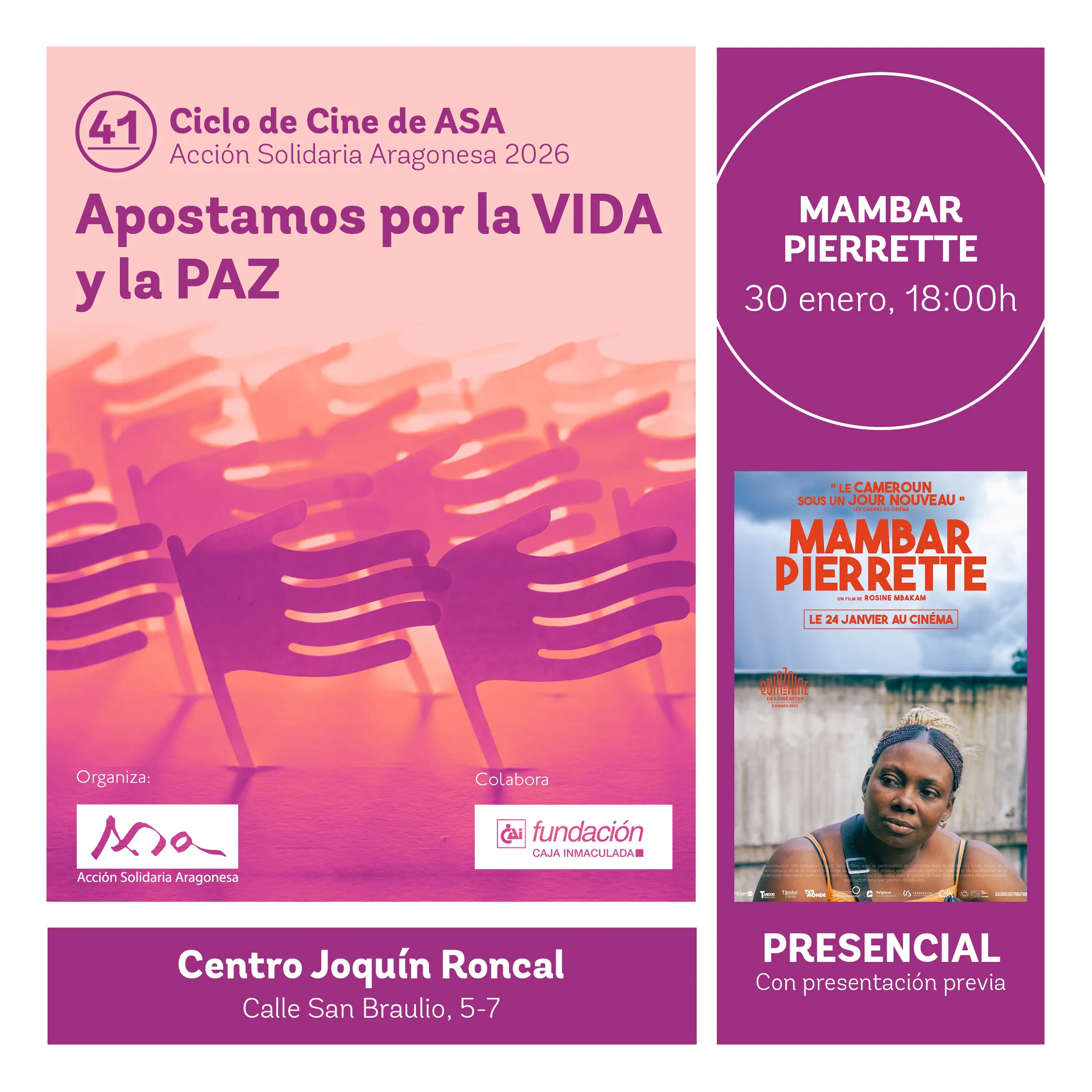 El 41º Ciclo de Cine de Acción Solidaria Aragonesa (ASA), bajo el lema “Apostamos por la vida y por la paz”, ofrece a la ciudadanía un espacio de reflexión y sensibilización a través del cine social y comprometido. A lo largo de varias proyecciones, el ciclo aborda conflictos armados, la defensa de los derechos humanos y la construcción de una cultura de paz, utilizando el lenguaje cinematográfico como herramienta para fomentar el pensamiento crítico y el compromiso social. La iniciativa se consolida, un año más, como una propuesta cultural de referencia en Aragón para acercar realidades globales y promover valores de solidaridad, justicia y convivencia pacífica.