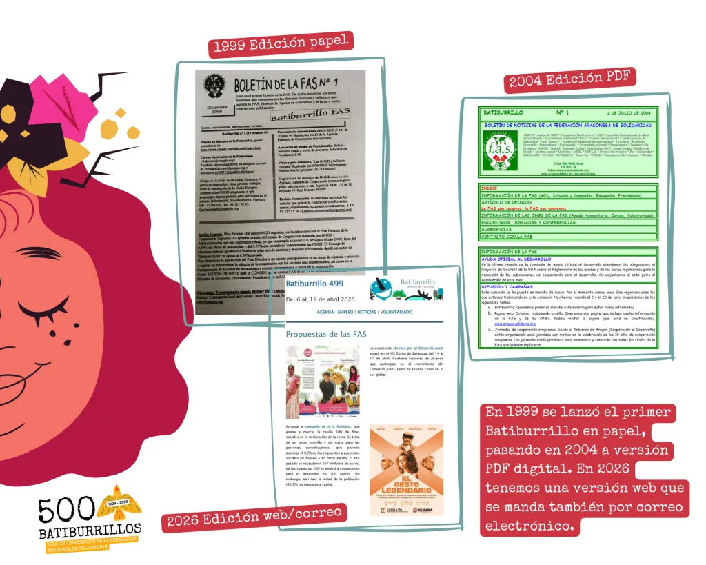 Allá por 1999 nació la primera versión de Batiburrillo: una publicación impresa que, a base de fotocopias, circulaba por los espacios solidarios vinculados a las ONGD de la FAS. Con el paso del tiempo, el boletín también fue evolucionando. En 2004 se lanzó su primera versión en PDF, que empezó a difundirse por correo electrónico. Pocos años después, Batiburrillo pasó a consolidarse como una publicación digital, distribuida por correo y accesible también a través de la web de la FAS. En estos 27 años, ha contribuido a movilizar a miles de personas y a dar visibilidad a miles de actividades, con más de 500 números que han llegado a la ciudadanía aragonesa.